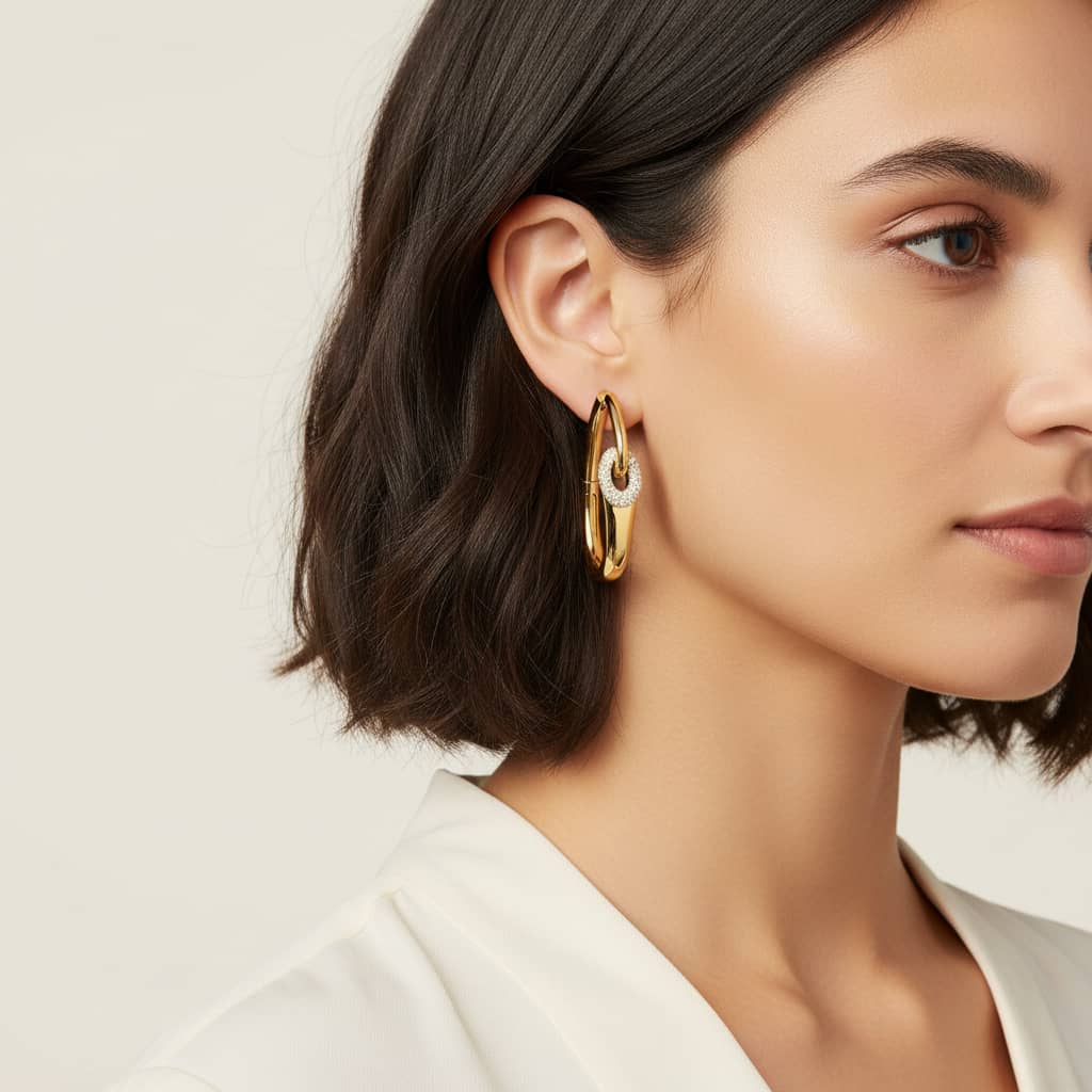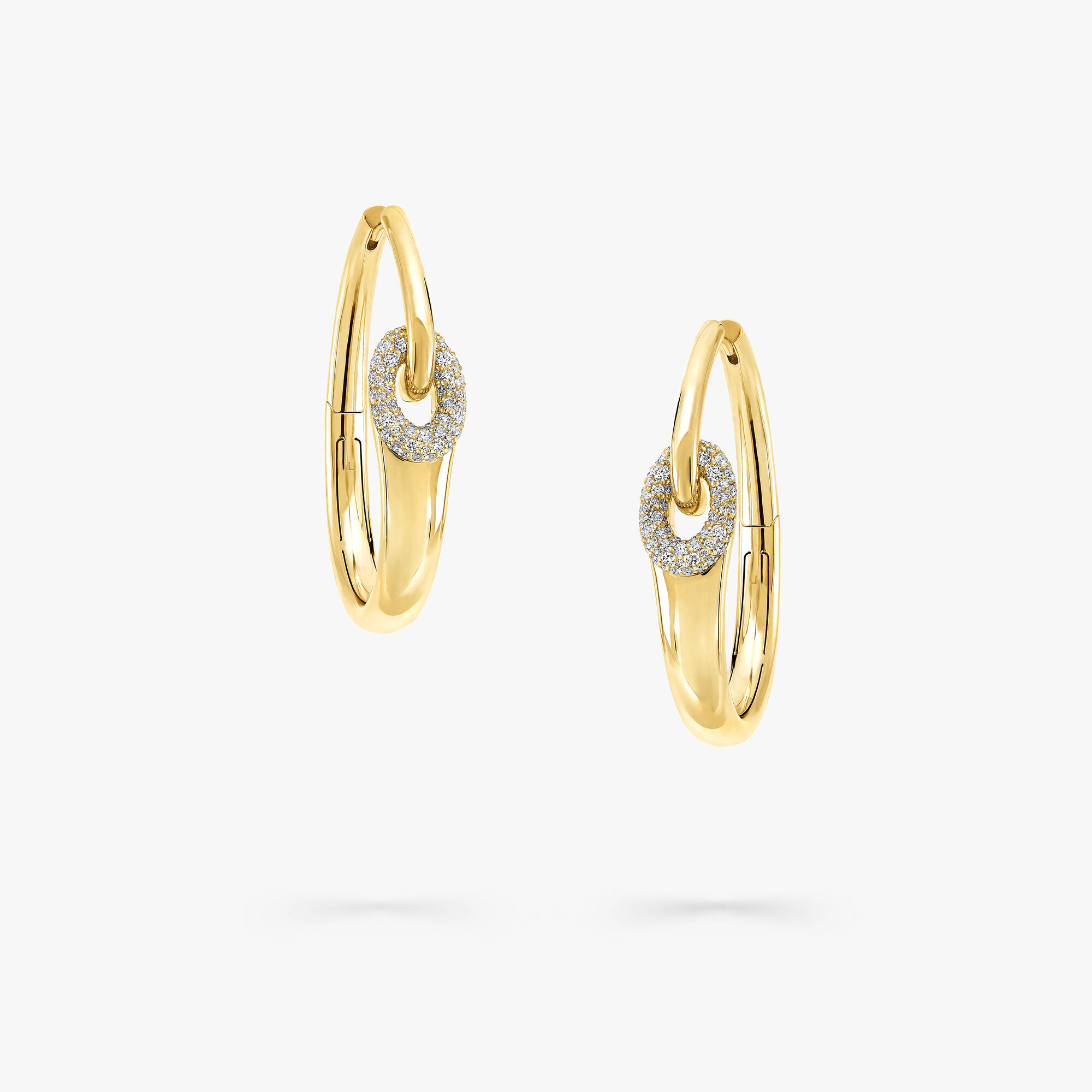 A modern design in which a graduated line of polished yellow gold curves gracefully around the earlobe, connected to a round pavé diamond–set oval loop.