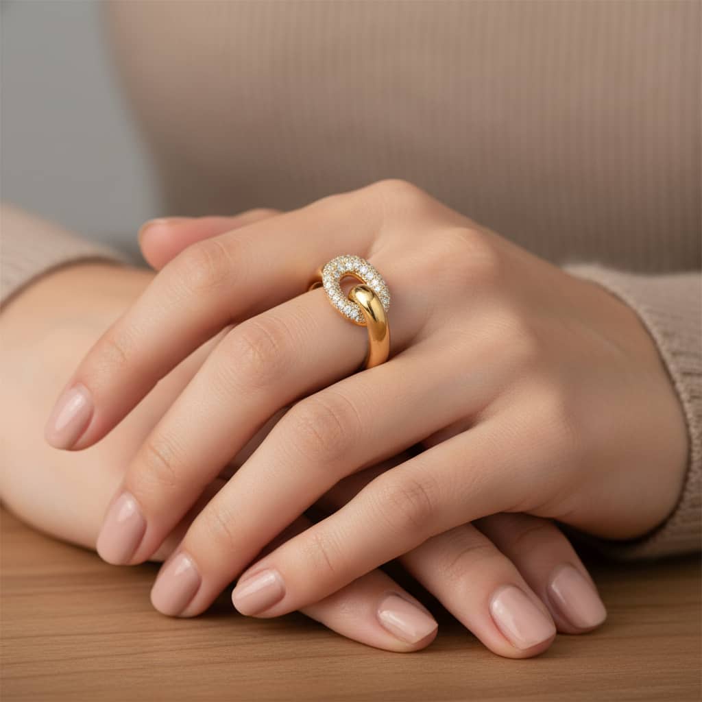 A tactile ring design featuring a polished yellow band that gracefully curves around the finger, seamlessly linked to an oval loop set with round pavé diamonds.