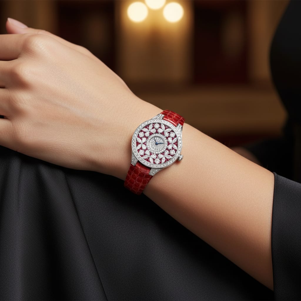 Showcasing Graff’s iconic butterfly motif, the Classic Butterfly watch in white gold celebrates the delicate grace of nature’s most enchanting creature with a stunning interplay of diamonds and rubies. Set on a vibrant red alligator strap, a fluttering array of butterflies appears to dance across the ruby dial, with pear shape and marquise diamonds capturing the intricate symmetry of their wings. The pavé diamond-set crown and clasp add refined sparkle, while the reverse of the case is engraved with a cluster of butterflies, exemplifying meticulous Swiss craftsmanship from Geneva.