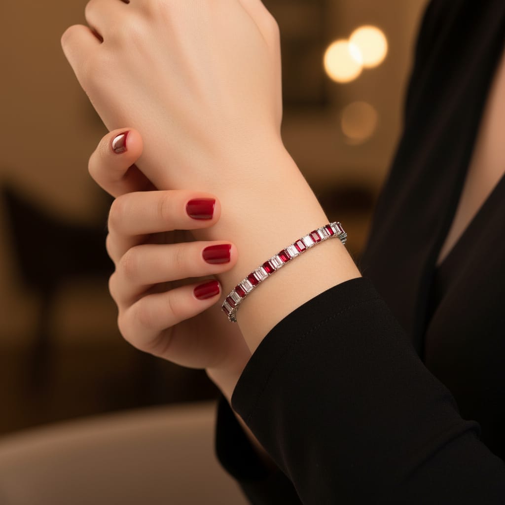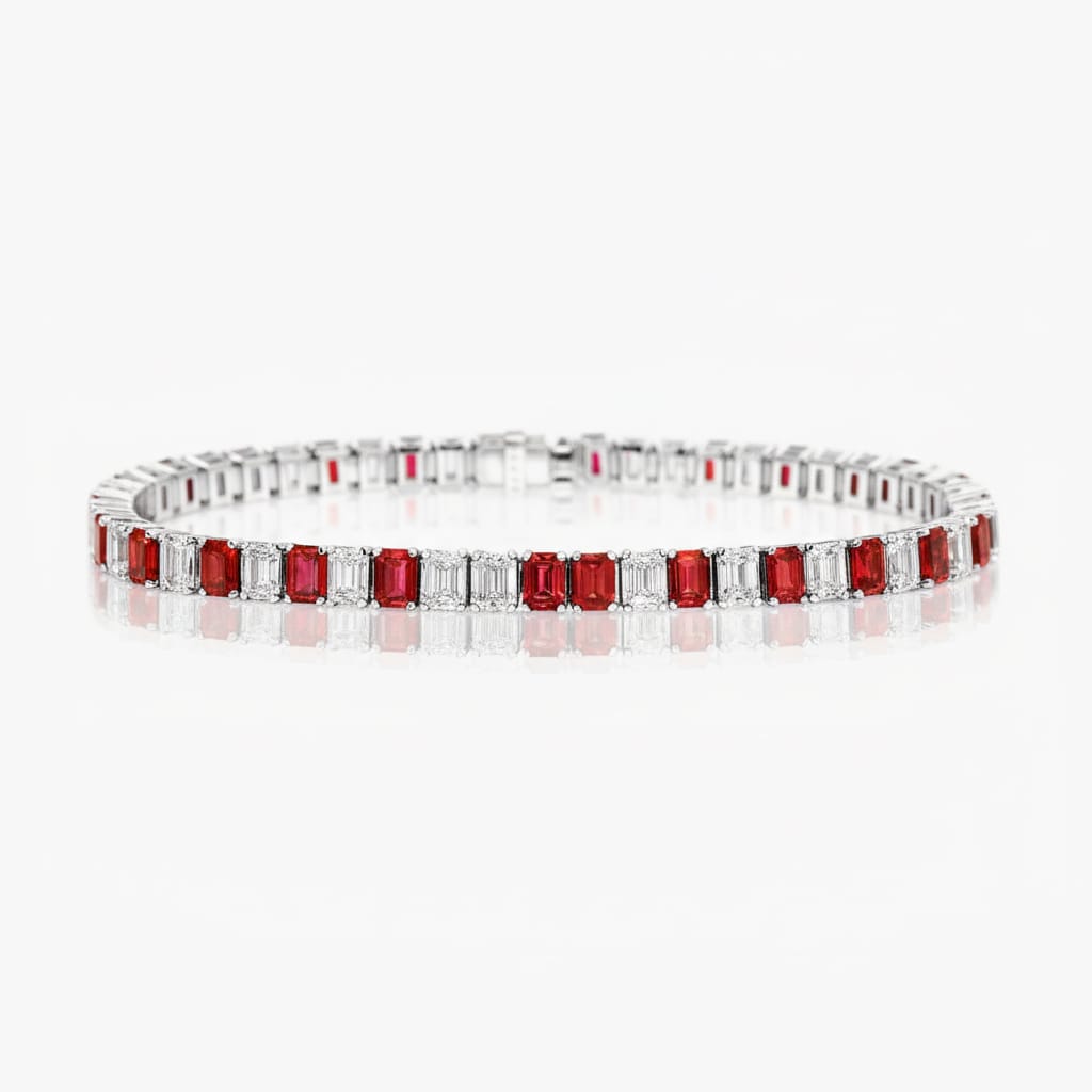 An exquisite Classic Graff bracelet celebrates the striking beauty of emerald-cut rubies paired with diamonds, set in a refined white gold framework that allows each gemstone to shine with maximum brilliance.