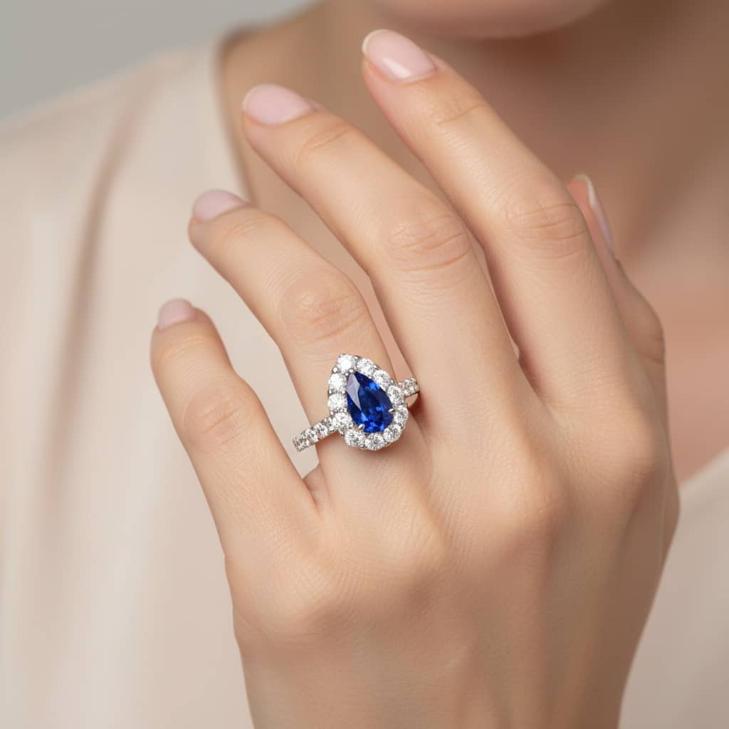 The Silhouette: An elegant pear-shaped sapphire that elongates the finger and maximizes color depth.