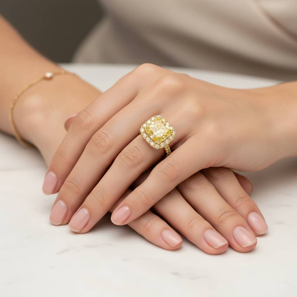 Color Enhancement: A dedicated halo of yellow pavé diamonds, expertly chosen to deepen the Fancy Vivid Yellow center stone.