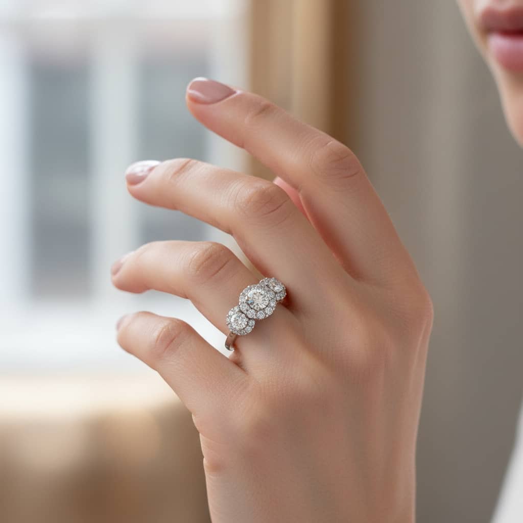 The Trilogy: A balanced three-stone arrangement with mirrored round silhouettes.