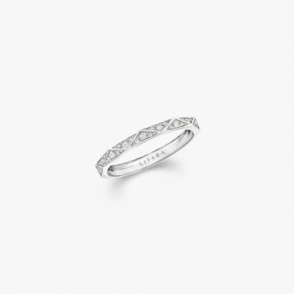 Expertly crafted in luminous white gold, this sleek 2.3 mm Litaraa Signature band is adorned with delicate pavé diamonds that shimmer with refined brilliance. Its angular, faceted form is inspired by the natural geometry of a diamond, creating a modern silhouette that reflects light beautifully from every angle.