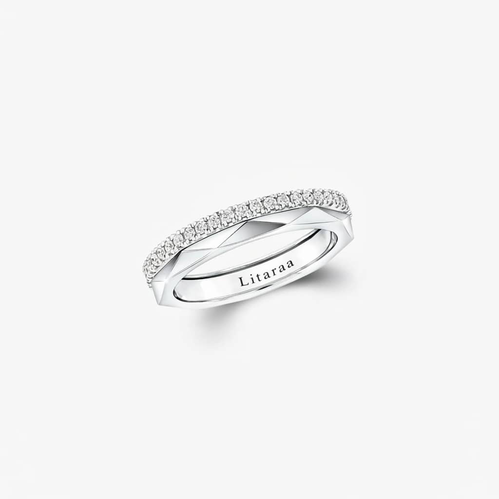 The Laurence Litaraa Signature Collection showcases a faceted bezel, an iconic design of the House. This elegant and understated ring combines the modern contrast of white gold with a delicate band of round pavé diamonds, reflecting the vision and artistry of its founder, Laurence Litaraa.