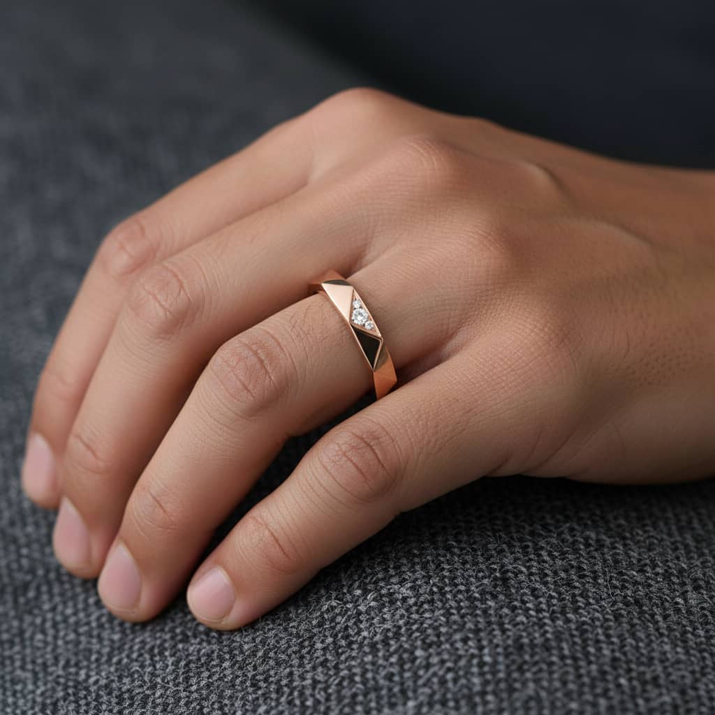 Inspired by a passion for exceptional diamonds, the Signature pavé diamond band is crafted in 18 carat rose gold with finely angled facets that reflect light beautifully. A delicate row of pavé diamonds is set along a single facet, adding a subtle yet striking brilliance to its modern, sculptural design.