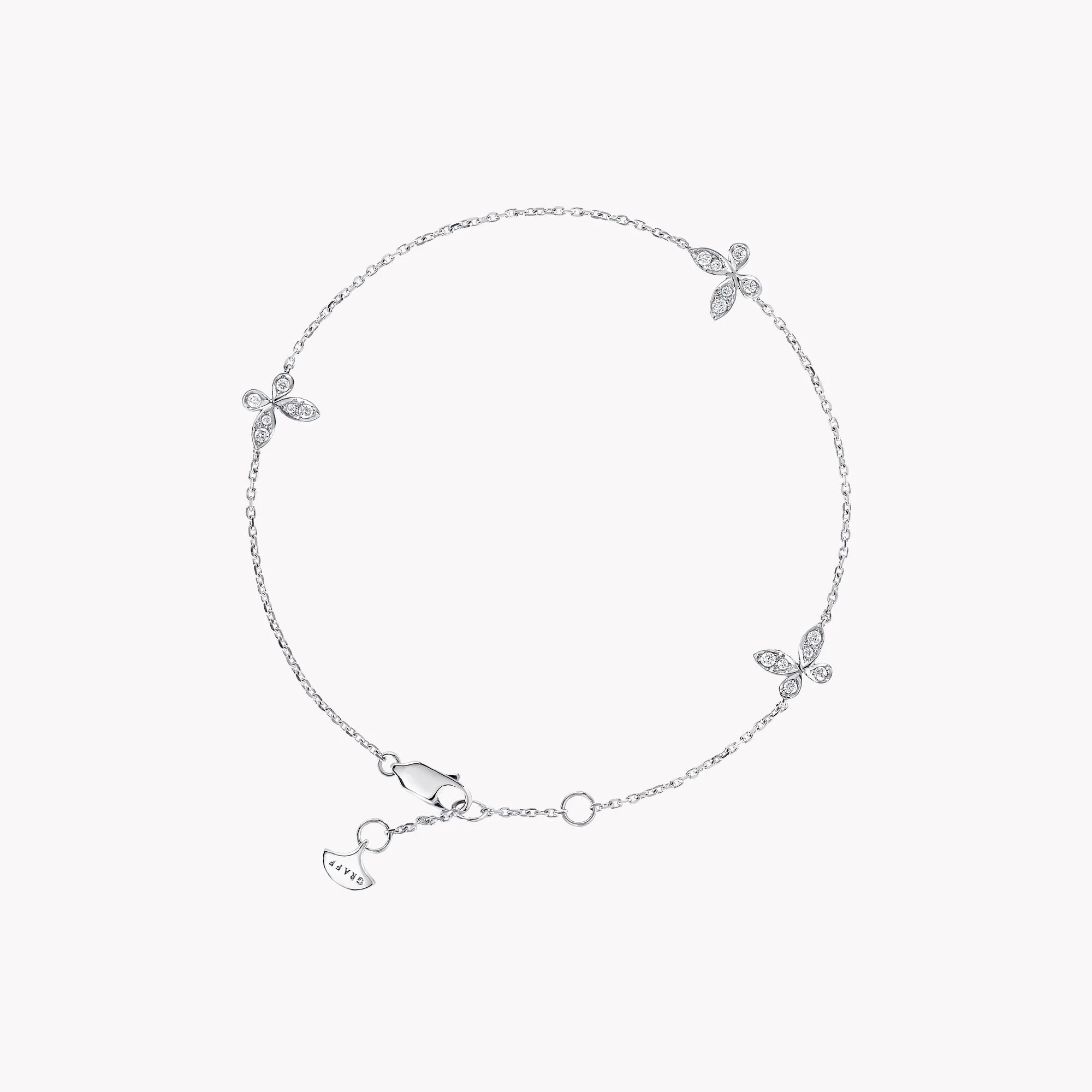 The Pavé Butterfly petite diamond bracelet in white gold is designed for everyday elegance. Featuring a trio of dancing butterflies, each delicately set with pavé diamonds, the bracelet sparkles beautifully whether worn alone or paired with the matching petite diamond necklace and stud earrings.
