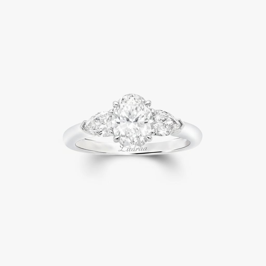 Crafted to highlight the captivating beauty and brilliance of the centre stone, this Promise engagement ring in platinum features a striking oval-cut diamond framed by perfectly matched pear-shaped side stones. The elegant arrangement enhances the natural sparkle of the diamond, creating a graceful and balanced silhouette.
