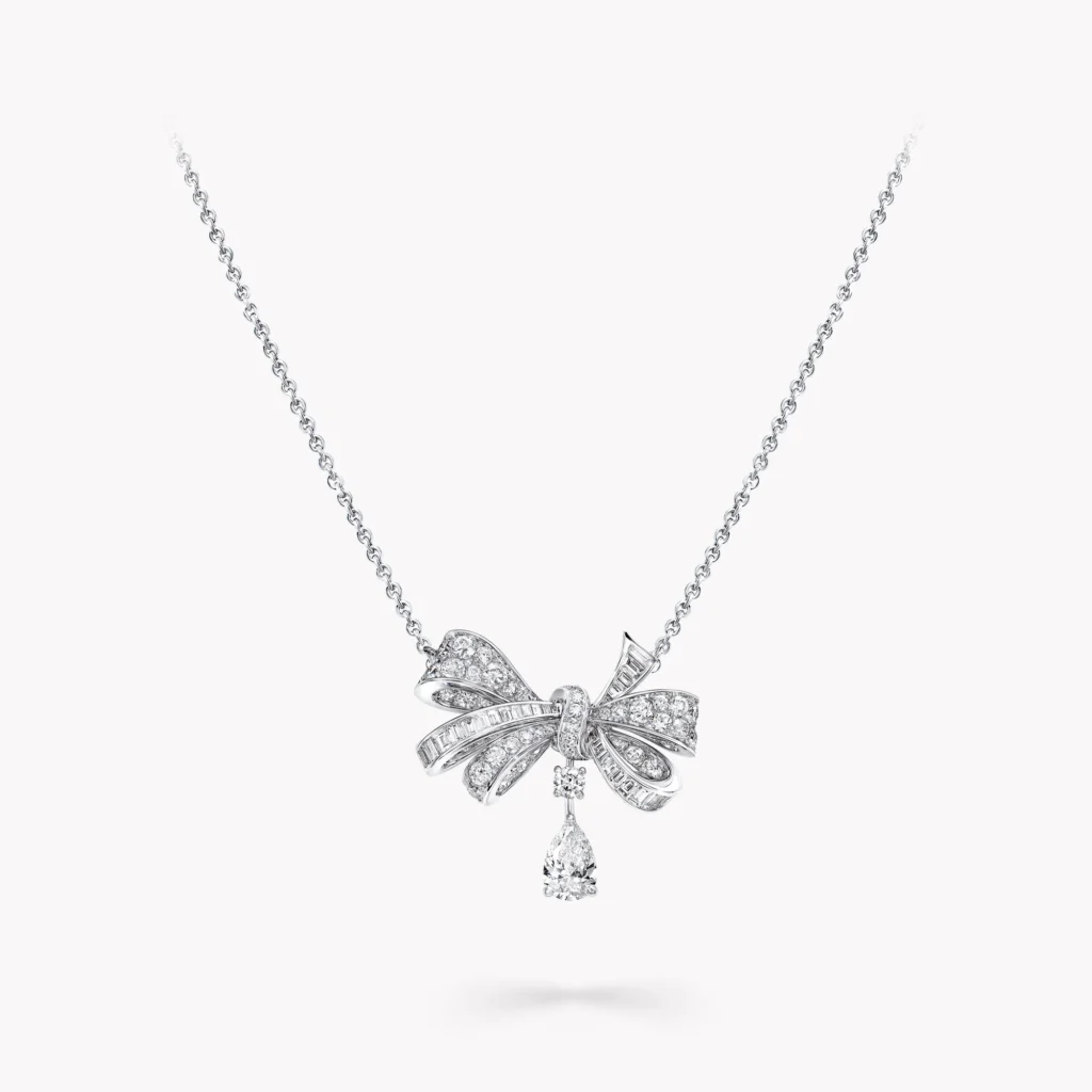 Handcrafted by Litaraa’s master artisans to capture the graceful curves of a silk ribbon, this Tilda’s Bow classic diamond drop pendant in white gold is set with custom-cut baguette and round diamonds. A beautifully balanced pear-shaped diamond drop is suspended beneath the elegant bow motif, creating a design that feels both refined and lifelike.