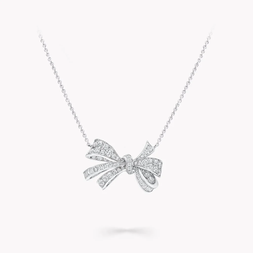 A charming Tilda’s Bow baguette-cut and round diamond pendant featuring a total approximate diamond weight of 1.70 carats