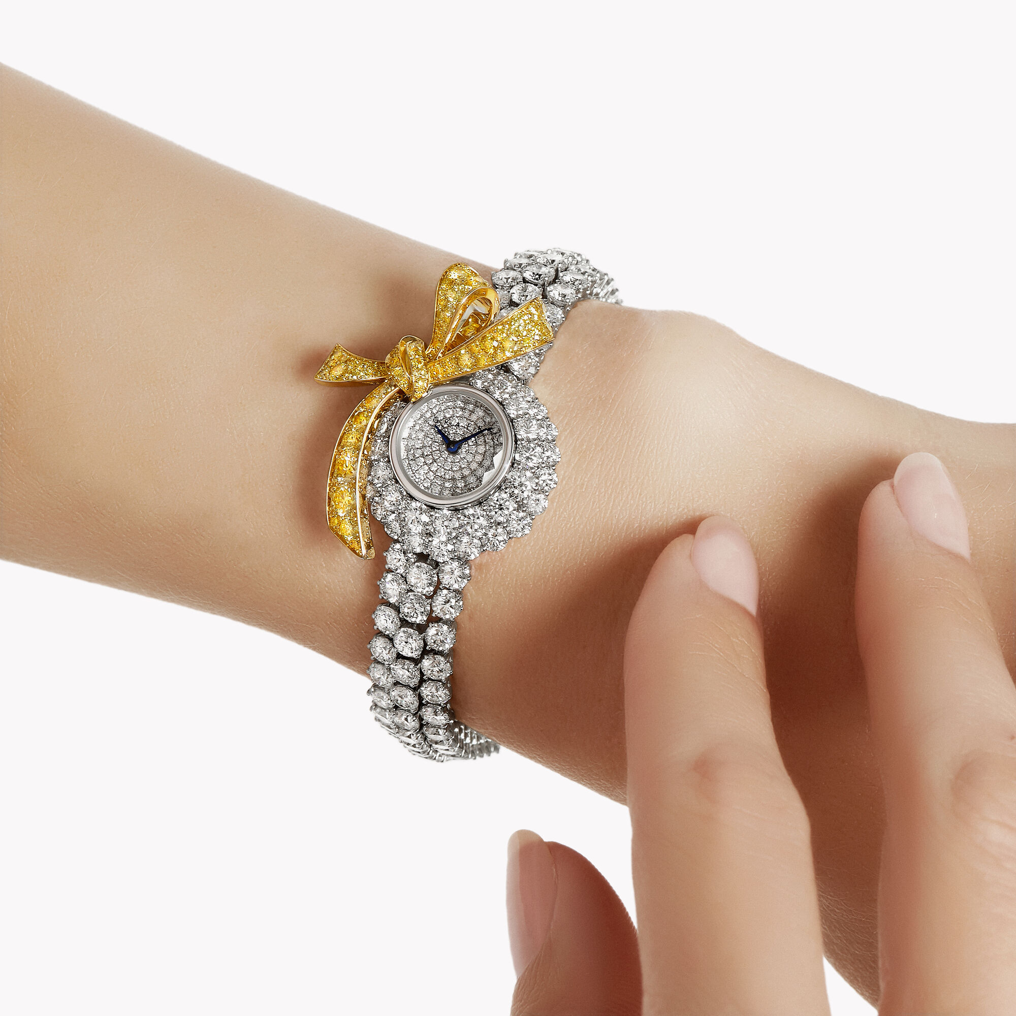 An exceptional Tilda’s Bow diamond watch in yellow and white gold with a total approximate diamond weight of 22.54 carats, including 1.55 carats of yellow diamonds.