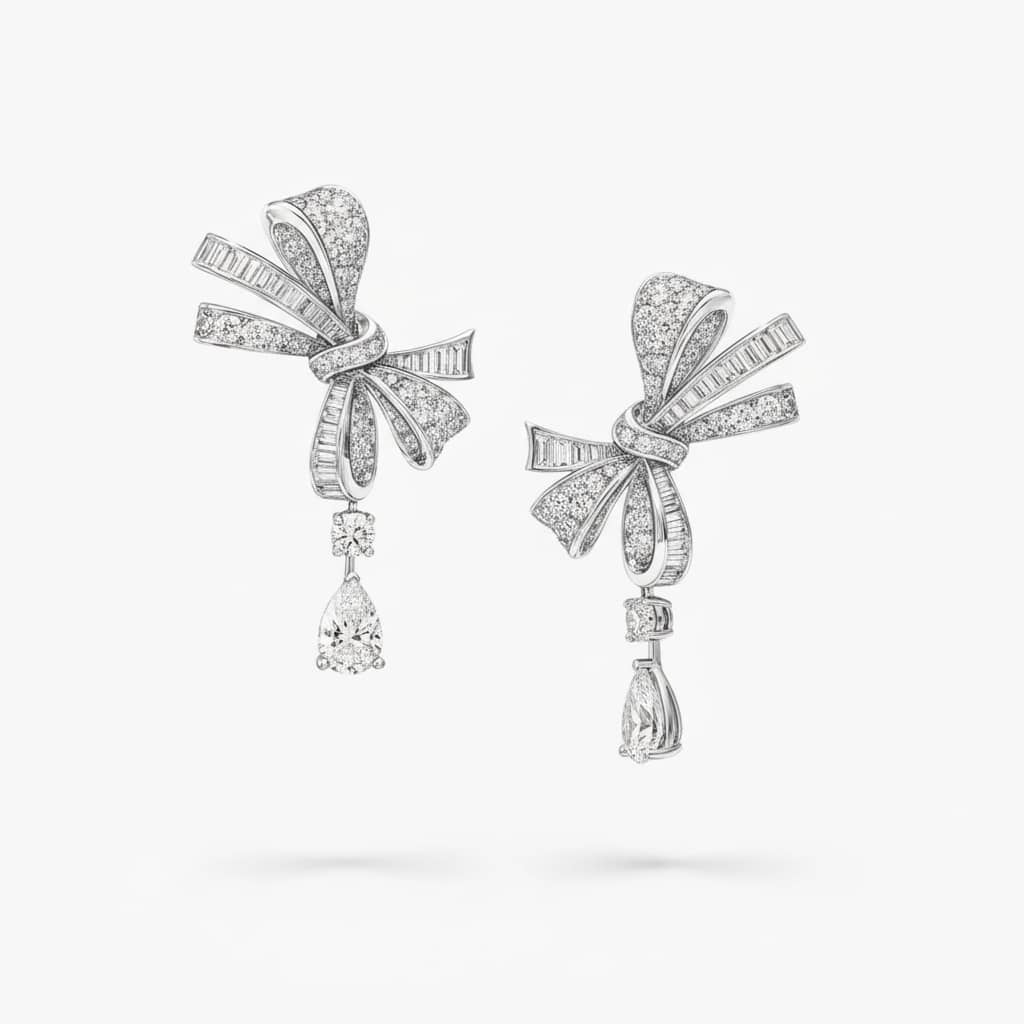 Gracefully suspended from radiant diamond bows, these elegant drop earrings in white gold are beautifully finished with pear-shaped diamonds that shimmer with every movement. Brilliant round diamonds sparkle between the elements, while custom-cut baguette and round diamonds are meticulously set to highlight the soft, flowing curves of the bow, creating a design full of light and life.